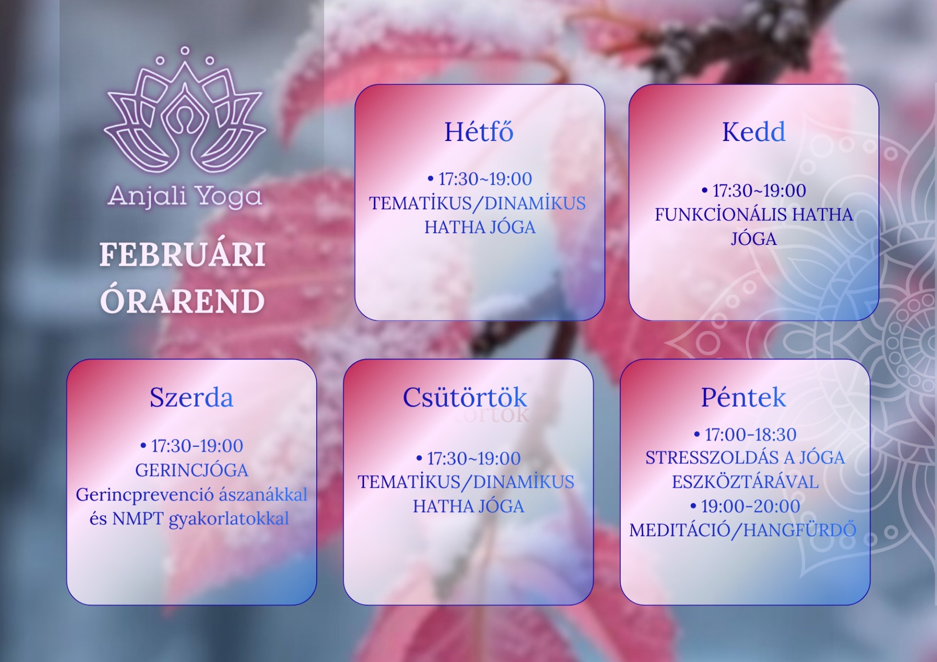 A februári órák az egyensúlyt és a belső stabilitást támogatják az idegrendszer megnyugtatásán keresztül. A gyakorlás finoman erősít és stabilizál, segít kapcsolatba kerülni a testünk természetes intelligenciájával.